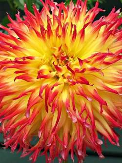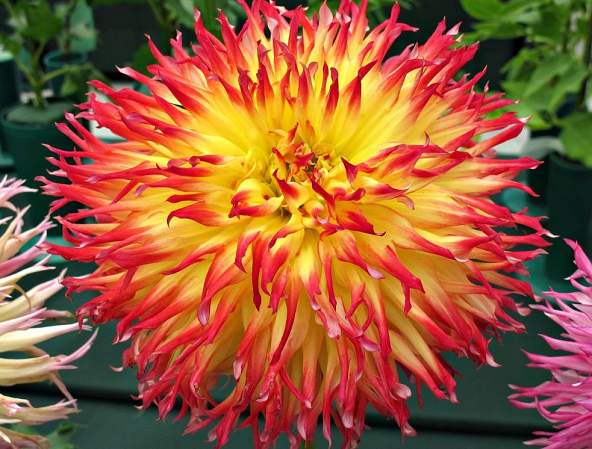 Георгин Pineland's Pam (Пайнлэндс Пэм). Необычайно яркий, праздничный сорт. Лепестки желтые с кораллово-красными расщепленными кончиками. Размер цветка от 20 см. Высота 90 см.