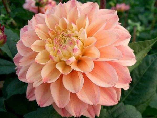 Георгин Princesse Elisabeth (Принцесса Елизавета). Цветок нежно-абрикосовый с жёлтым центром, диаметром 10 см. Цветет обильно и продолжительно. Устойчив к неблагоприятным условиям, болезням и вредителям. Отличаются невысоким компактным кустом. Пригоден для выращивания в контейнерах и горшках.
