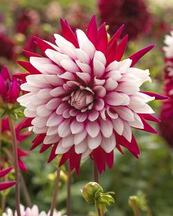Георгин Rebecca's World (Ребекказ Уорлд). Популярный, яркий сорт. Каждый цветок по своему уникален! На кусте одновременно могут цвести разные цветки в сочетании белых итемно-бордовых тонов, создавая тем самым эффектный контраст, диаметр цветка 13 см.