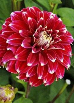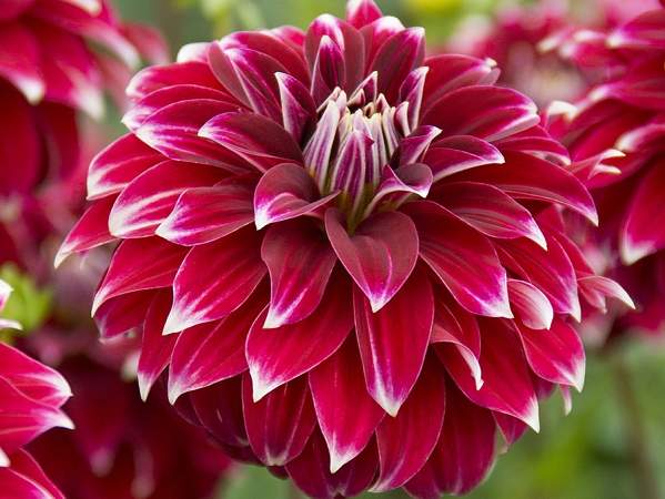 Георгин Red Rock (Ред Рок). Куст мощный, пышный, стебли высотой 80 см. Листья перистые, темно-зеленые, многочисленные. Соцветие махровое, рубиновое с белыми кончиками. Лепестки плоские, широкие, заостренные на концах. Диаметр цветка 11 см. Предпочитает солнечные места, защищенные от ветра, плодородные хорошо дренированные почвы. Используется для групповых посадок и на срезку. Цветет с июля по октябрь. Устойчив к неблагоприятным условиям роста, к болезням и вредителям.