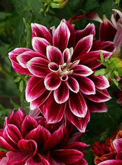 Георгин See Wood Glory (Си Вуд Глори). Роскошный георгин из группы Декоративных. Цвет бордовый, кончики "лепестков" белые. Диаметр соцветия около 15 см. Соцветие прекрасной формы. Для лучшего цветения и получения более крупных цветков необходимо провести удаление боковых бутонов. Трехлетние клубни требуют омоложения способом деления или черенкования.