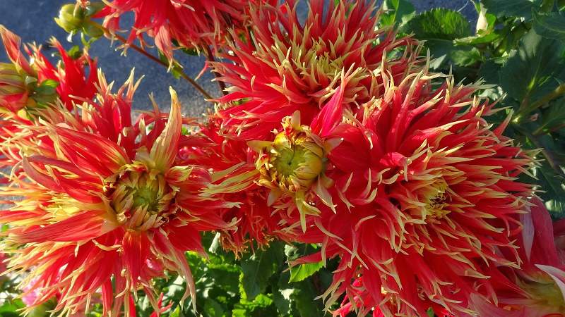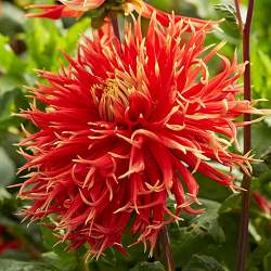 Георгин Show N Tell (Шоу Энд Телл). Высота растения 110 см. Размер соцветия 20-25 см. Роскошная представительница кружевных георгин. Она выделяется огромными соцветиями необычной формы и цвета. Рассеченные на кончиках лепестки придают цветку воздушности и беззаботности. А пестрая окраска лепестков изумляет: они красные с ярко-желтыми кончиками и штрихами.