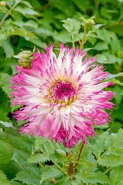 Георгин Snoho Diane (Снохо Диана). Белый с пурпурными кончиками, диаметр цветка 18 см.