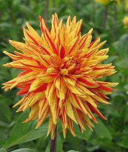Георгин Striped Vulkan (Страйпт Вулкан). Роскошный кактусовый георгин желтого цвета с красными штрихами. Диаметр соцветия 22 см.