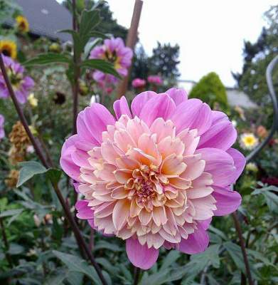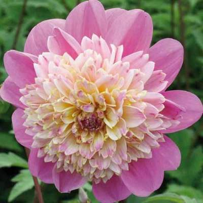 Георгин Take Off (Тейк Офф). Высота 90-100 см. Центр цветка густомахровый, состоящий из длинных лепестков кремово-желтого с розовым и сиреневым оттенков. Его окаймляет несколько рядов широких плоских сиренево-розовых лепестков.