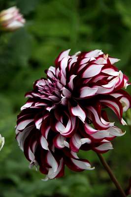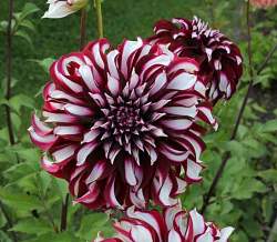 Георгин Tartan (Тартан). Цветок исключительной красоты. Лепестки темно-бордово-фиолетовые с широким белым языком по центру, волнистые. Цветки крупные, 15 см и более. Высота растения 100 см.