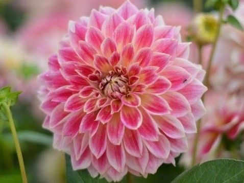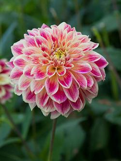 Георгин Temple of Beauty (Темпл ов Бьюти). Оригинальное сочетание окрасок! Кремовый плавно перетекает в розовый, на кончиках лепестков красуются малиново-розовые мазки. Края очерчены светлой тонкой каймой.