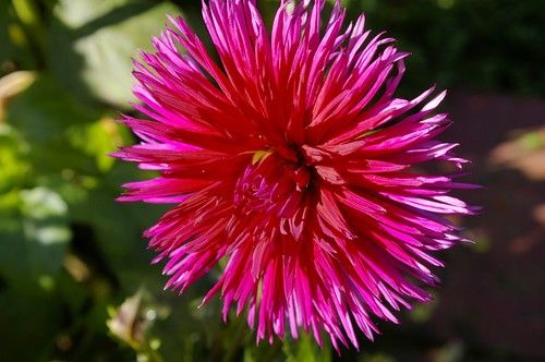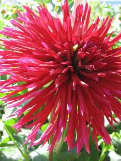 Георгин Urchin Us (Эрчин). Отличительной чертой вида являются лепестки свернутые в трубочки, что придает цветку "колючий" вид. Соцветие махровое, темно-красное, диаметром 10-15 см.