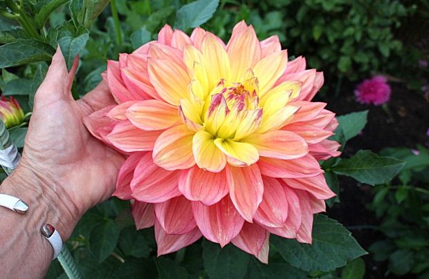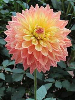 Георгин Wanda's Aurora (Вандас Аврора). Цветок очень крупный, 25 см в диаметре, совершенной формы, похож на нимфейный. Центр цветка желты, к периферии кораллово-розовый. Высота куста 120 см. Прекрасная срезка.