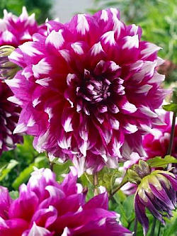 Георгин Yarra Falls (Ярра Фоллс). Роскошный георгин из группы Декоративных. Диаметр соцветия около 20 см. Соцветие прекрасной формы, малиновые "лепестки" с белыми пятнышками на кончиках делают сорт очень нарядным. Замечательное украшение коттеджного сада!