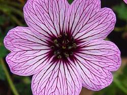 Герань Ballerina (Балерина). Лепестки бледно-розовые с многочисленными фиолетовыми прожилками. Невероятно красивое растение с оливково-зелеными листьями с затейливым рисунком! Цветение очень обильное и дружное.