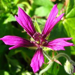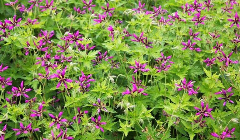 Герань Catherine Deneuve (Катрин Денёв). Новый почвопокровный сорт герани. Высота около 50 см, диаметр около 70 см. Листья желто-зеленые, лопастные, изрезанные. Цветки от ярко-малинового до пурпурного цвета, диаметром 4 см, в форме звезды. Цветет с июня по сентябрь.