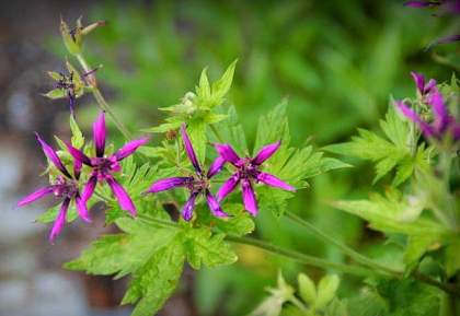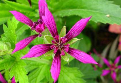 Герань Catherine Deneuve (Катрин Денёв). Новый почвопокровный сорт герани. Высота около 50 см, диаметр около 70 см. Листья желто-зеленые, лопастные, изрезанные. Цветки от ярко-малинового до пурпурного цвета, диаметром 4 см, в форме звезды. Цветет с июня по сентябрь.