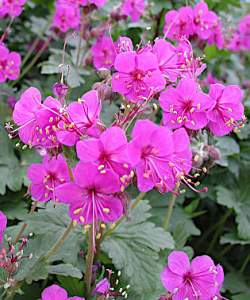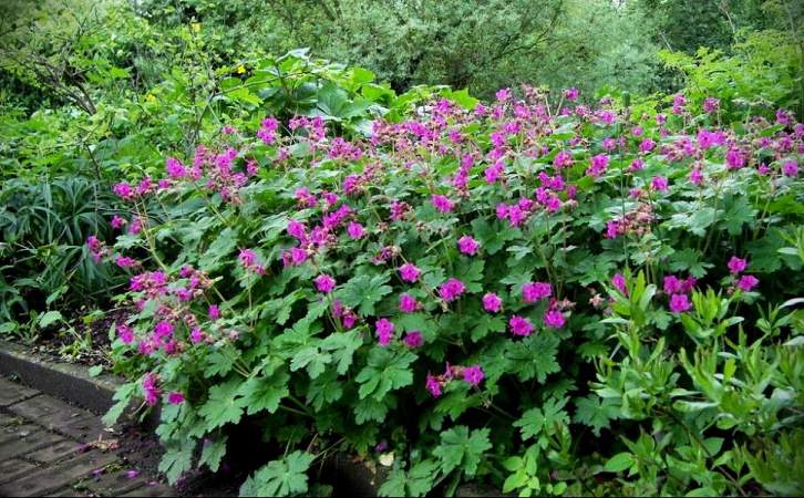 Герань Czakor (Закор). У этого сорта цветки самые яркие среди герани крупнокорневищной. Они красивого лилового цвета. Сорт компактнее, чем видовое растение. От сорта Биванс Вэраети отличается более яркими цветками и наличием очаровательных тычинок.