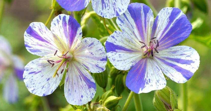 Герань Delft Blue Butterfly (Делфт Блу Баттерфлай). Сорт похож на Splish Splash, но блики более синие и яркие. Разбросанные по белому фону лепестков, они дарят прелестное впечатление! Цветков множество, они словно парят над пышным кустом. Герань луговая очень неприхотлива, выносит как частичное затенение, так и временное переувлажнение.