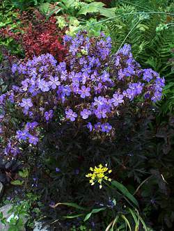 Герань Hocus Pocus (Хокус Покус). Цветки простые, крупные, лавандово-лиловые, на темных цветоносах. Цветение очень обильное и продолжительное.