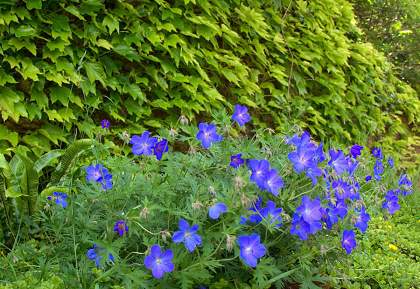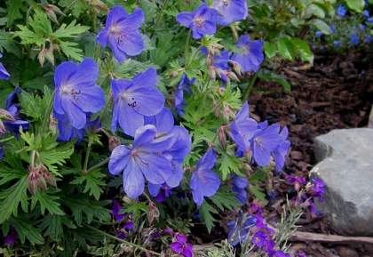 Герань Johnsons Blue (Джонсонс Блу). Произошла от скрещивания герани гималайской и герани луговой, имеет высоту около 45 см и синие цветки, появляющиеся рано. Но самое приятное, что цветет "Johnson's Blue" очень обильно и продолжительно.