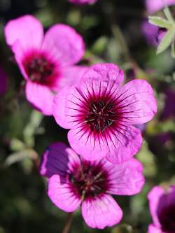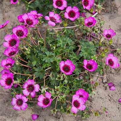 Герань пепельная Jolly Jewel Night (Джолли Джэвел Найт). Сортосерия "Jolly Jewel". Цветки диаметром 3 см, розовые с тёмно-фиолетовым центром. Цветение длительное, в июне-августе. Высота 15 см, ширина 25 см. Место солнечное или полутенистое. Почва влажная, дренированная.