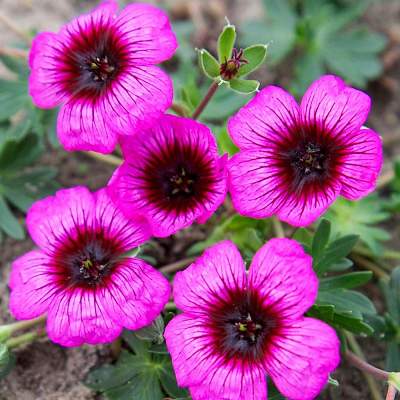 Герань пепельная Jolly Jewel Night (Джолли Джэвел Найт). Сортосерия "Jolly Jewel". Цветки диаметром 3 см, розовые с тёмно-фиолетовым центром. Цветение длительное, в июне-августе. Высота 15 см, ширина 25 см. Место солнечное или полутенистое. Почва влажная, дренированная.