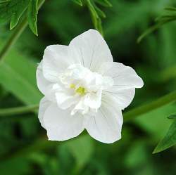 Цветки очень красивые, крупные, махровые, белого цвета. Цветение обильное в июне-июле, повторное (после обрезки) — в августе.