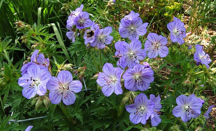 С успехом используется в смешанных цветниках и природных композициях имитирующих луг. Прекрасна с розовыми розами. После первой волны цветения луговые герани часто становятся неряшливыми. Самый простой выход - обрезать куст вместе с листьями. Листья снова быстро отрастут и куст будет свежим.