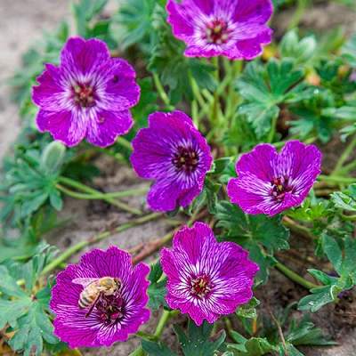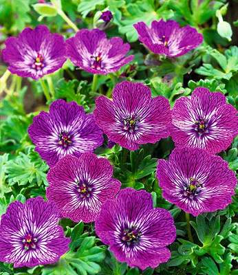 Герань пепельная Jolly Jewel Lilac (Джолли Джювел Лилак). Один из самых красивых сортов. Цветки лиловые с белыми полосками и тёмно-фиолетовыми прожилками. Цветение длительное, в июне-августе, наиболее обильное в начале лета, затем периодическое. Высота 12-15 см, ширина 25 см. Место солнечное или полутенистое. Почва влажная, дренированная. Зона 4 (до -29ºС).