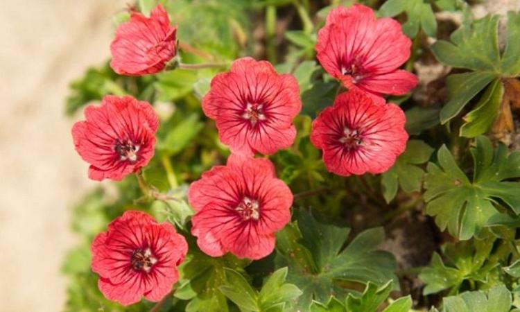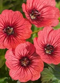 Герань пепельная Jolly Jewel Salmon (Джолли Джювел Салмон). Цветки очень редкой для гераней окраски, яркие, почти лососёво-оранжевые (коралловые) с бордовыми прожилками. Цветение длительное, в июне-августе, наиболее обильное в начале лета, затем периодическое. Высота 12-15 см, ширина 25 см. Место солнечное или полутенистое. Почва влажная, дренированная. Зона 4 (до -29ºС).