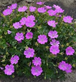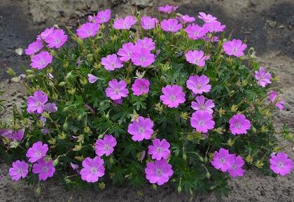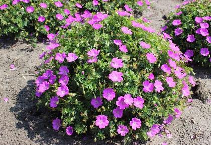 Герань кроваво-красная Pink Diadem (Пинк Диадем). Почвопокровное, бордюрное и контейнерное растение. Компактный аккуратный кустик высотой 20 см и шириной 40 см. Цветки яркие розовые с более тёмными прожилками. Цветение в июне-сентябре. Листва красивая, глубоко рассечённая, осенью краснеет. Место солнечное или полутенистое. Почва дренированная.