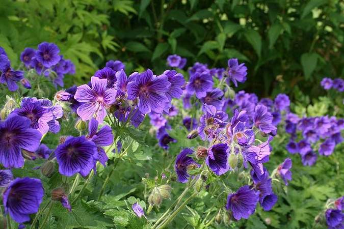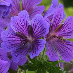 Герань великолепная Rosemoor (Розмур). Цветки сине-фиолетовые с темными прожилками. Куст мощный, при благоприятных условиях образует заросли. Листья ярко-зеленые, округлые, опушенные, с приятным ароматом. Осенью приобретают красивую окраску. Крупные цветки собраны в рыхлые зонтики над листвой.