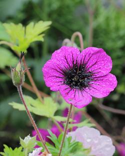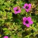Герань Sandrine (Сандрин). Цветы ярко пурпурно-фиолетовые с чёрным центром и жилкованием. Листья весной жёлтые, летом молодые жёлтые, остальные зелёные. Может достигать 50 см в высоту. В зависимости от условий произрастания. Предпочитает солнечные места, но растет и в легкой полутени.