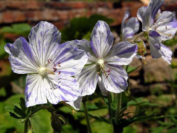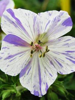 Герань Splish splash (Сплиш Сплеш). Сорт имеет белые цветки с отметинами лилово-синего цвета. Каждый цветок достигает 3 см в диаметре. Растение любит хорошее освещение, но также неплохо растет в легкой полутени.