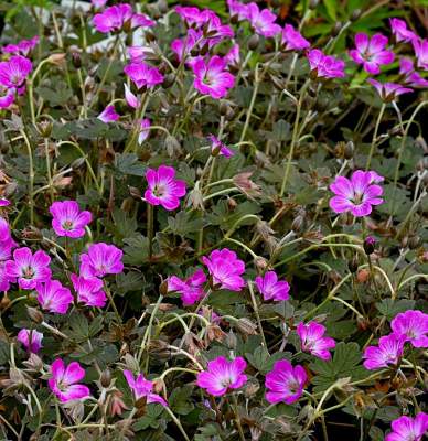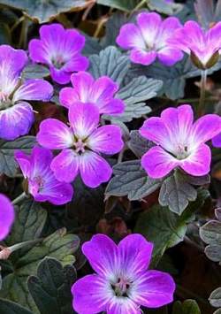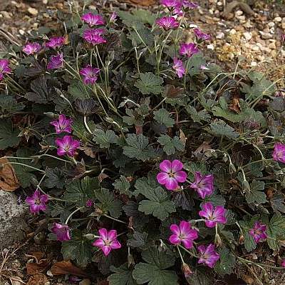 Герань сидячецветковая Tanya Rendall (Таня Рендалл). Миниатюрная герань (высота до 20 см) с мелкими темными листьями и темно-розовыми цветками. В центре цветка большой белый глазок. Хорошо видны темные жилки. Листья в начале вегетации красноватые. Цветет продолжительно и обильно.