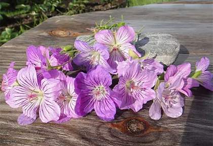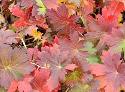 Герань Власова. Весной листья с пурпурным напылением, осенью окрашиваются во все оттенки желтого, пурпурного и красного. Листья красивые, резные. Цветет продолжительно, с середины лета до осени, цветки сиреневые с жилками. Высота около 60 см. Очень неприхотлива и морозостойка.