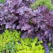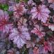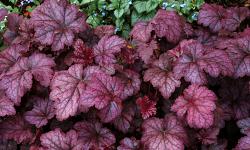 Гейхера гибридная Ametyst Myst (Аметист Мист). Изумительный сорт, притягивающий внимание темно-аметистовой с серебристыми пятнами листвой, которая по окраске сильно отличается от пурпурных и бордовых оттенков других гейхер; к осени лист становится "помятым" и приобретает бордово-зеленоватые тона, а пятна светлеют, добавляя контрастность. Отлично сочетается с растениями, имеющими листья цвета лайма.