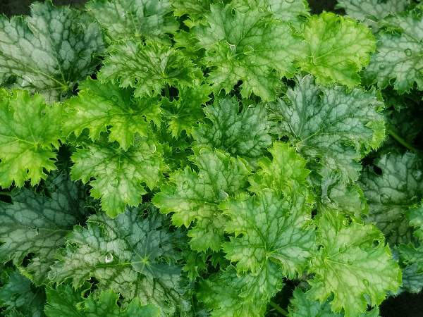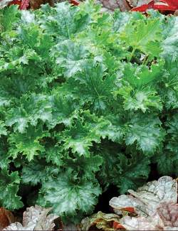Гейхера Apple Crisp (Эппл Крисп). Листья удивительно красивые, ярко-зеленые, бахромчатые, гофрированные, с серебристым рисунком. Цветет белыми цветками в июне-июле.