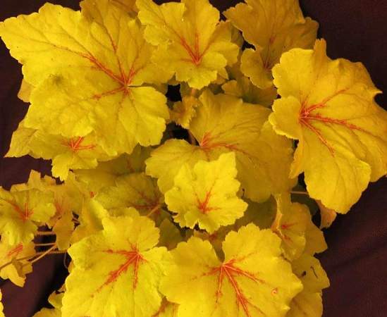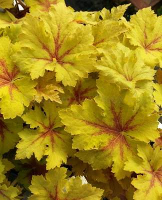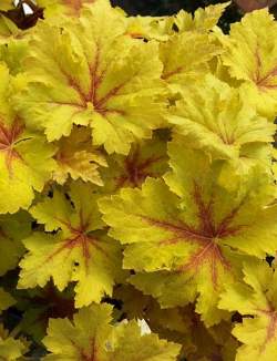 Гейхера Art Tropico (Арт Тропико). Листья крупные, лимонно-желтые с красноватым рисунком в центре. Высота кочки около 30 см. Цветки белые, собраны в соцветия на высоких цветоносах. Цветет в мае-июне.