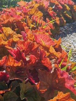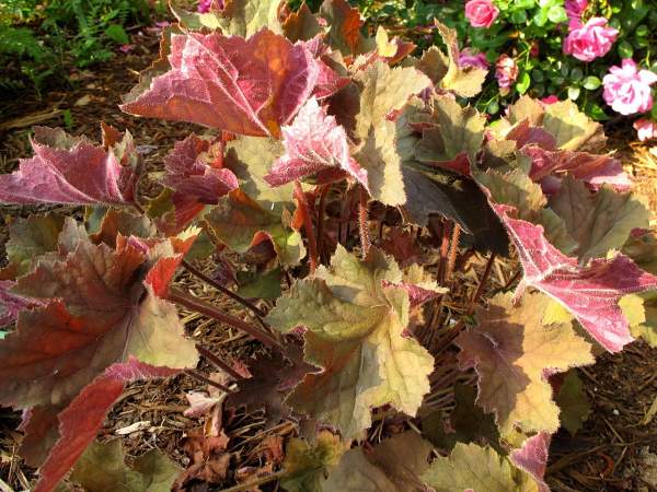 Гейхера Big Top Bronze (Биг Топ Бронз). Данный сорт необычен тем, что листья с нижней стороны имеют пурпурно-красный цвет, а снаружи – бронзовые, за что сорт и получил свое название. Высота 40 см. Цветки очень привлекательные, красные, кружевные. Цветоносы высотой до 100 см. Куст в цвету очень красив.