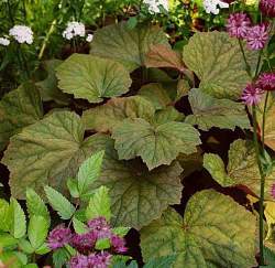 Большие, зубчатые листья на длинных черешках в молодости имеют матово-бронзовую окраску, возрастом зеленеют. Цветы белые. Прекрасно себя чувствуют на открытых светлых, но нежарких и лёгкозатененных местах, например, в легкой ажурной тени деревьев. Большинство видов гейхер предпочитают полутень, где солнце бывает в ранние утренние часы, что гарантирует яркость окраски листьев. Растение используют при переходе и разбавке цвета на клумбах и в цветниках. Гейхеры прекрасно подходят для оформления береговой зоны водоемов, её преимущество — сохранение растениями декоративности с ранней весны до наступления осенних заморозков.