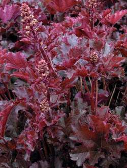 Гейхера гибридная Crimson Curls (Кримсон Кёлс). Листва различных оттенков темно-зеленого и темно-пурпурного, с сильной гофрировкой по краям и малиновой изнанкой. Розовые цветки в конических соцветиях. Одинаково хорошо чувствует себя и на солнце, и в тени.