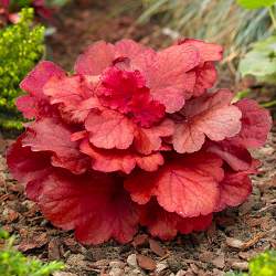 Гейхера Fire Alarm (Фае Аларм). Один из самых ярких сортов в красной гамме. Особенно ярок весной и осенью. Листья крупные, плотные и не деформируются, оранжево-красного цвета. Цветки белые на красных черешках. Цветет в мае-июне. Высота розетки 35 см, диаметр 50 см. Предпочитает солнце, полутень. Требует плодородных влажных почв.