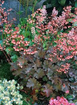 Гейхера Fireworks (Фаевокс). Украсит практически любой цветник в саду. Коричневато-зелёные листья со слегка волнистым краем приобретают к осени бронзовый оттенок. Отличается исключительно обильным и нередко повторным цветением даже в тенистом месте. На открытом пространстве с лёгким притенением цветки более насыщенного кораллово-розового цвета. Почвы нейтральные или слабокислые.