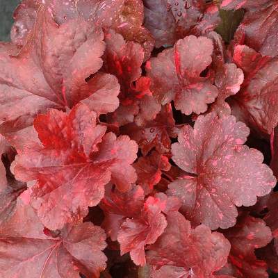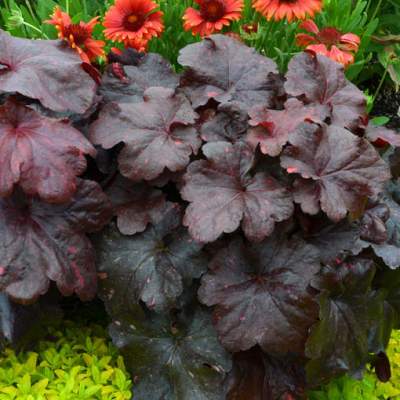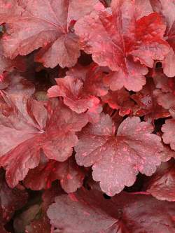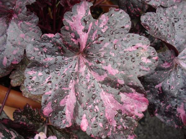 Гейхера Galaxy (Гэлэкси). Высота 23 см, цветонос 33 см, листья очень большие, толстые и кожистые, блестящие, весной красные, затем почти чёрные с ярко-розово–красными пятнами, цветы белые.