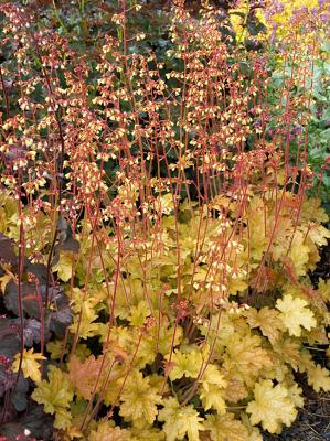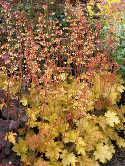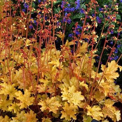 Гейхера Ginger Ale (Джинджер Эль). Кремово-рыжая листва с серебристым оттенком и прожилками на тон темнее. Цветки практически тон в тон с листвой, светлые, желто-розовые. Нарастает хорошо. Предпочитает тень-полутень, на солнце может подгорать.