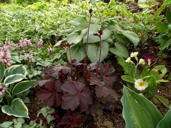 Гейхера Kira Black Forest (Кира Блэк Форест). Листья темно-пурпурные с блеском. Цветки белые. Высота до 30 см. Цветет в июле-августе.