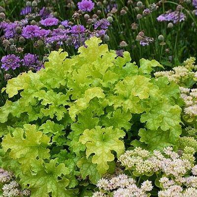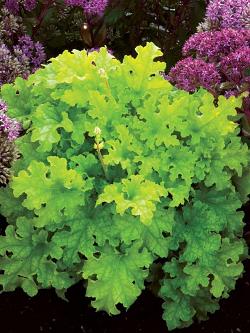 Гейхера Lime Ruffles (Лайм Рафлс). Наполнит ваш сад нежными красками. Светло-салатовые гофрированные листья отлично смотрятся в сочетании с хостами, папоротниками и другими декоративными растениями. В начале лета и без того эффектный вид дополняется белыми метельчатыми соцветиями.