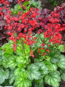 Гейхера Lipstick (Липстик). Листья светло-зеленые с темным узором и серебристым напылением. Цветки темно-красные на высоких цветоносах. Очень эффектное сочетание. Цветет обильно.