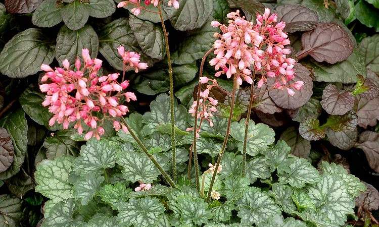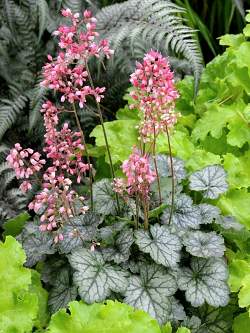 Гейхера Little Cutie Peppermint (Литтл Кьюти Пеперминт). Куст компактный, в цвету высотой 30 см. Листья аккуратные, округлые, серебристо-зеленые. Цветет розовыми цветками в июне-июле. Очень красивое сочетание серебристых листьев и розовых соцветий!