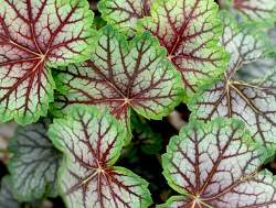 Гейхера Magic Color (Мэджик Колор). Одна из эффектнейших гейхер. Ярко-зеленая листва с темными прожилками и оранжевой окантовкой со временем становится розоватой со стальным оттенком, темными венами и красными краями. Предпочитает посадку на солнечном месте.