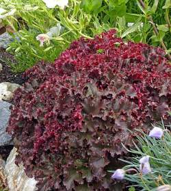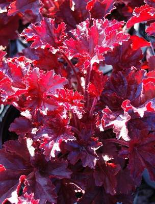 Гейхера Melting Fire (Мэлтин Файр). Листья красные с различными оттенками, сильно гофрированные. Розетка плотная, высотой 20 см, в цвету 40 см. Цветки белые. Цветет в июле-августе.