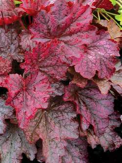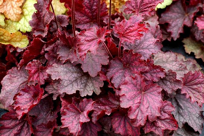 Гейхера Midnight Bayou (Миднайт Байу). Неприхотливое многолетнее вечнозеленое растение. Кустик высотой 30 см и шириной до 55 см образован розеткой листьев. Листья крупные, кленовидной формы, пурпурно-красного цвета с переходом в красно-фиолетовый с серебристой вуалью, жилки контрастные, темные. Цветет в мае-июне светло-розовыми колокольчатыми цветками. Предпочитает легкие, умеренно увлажненные почвы и полутень.